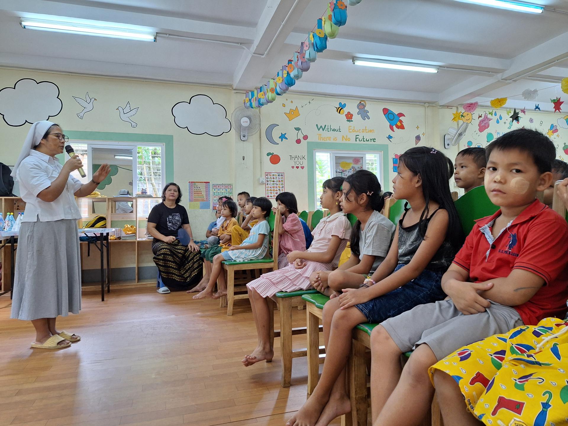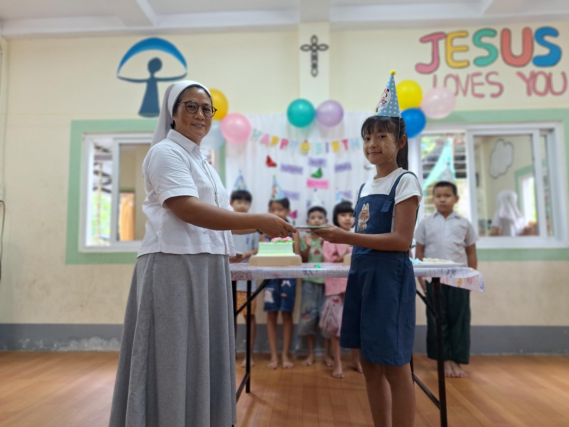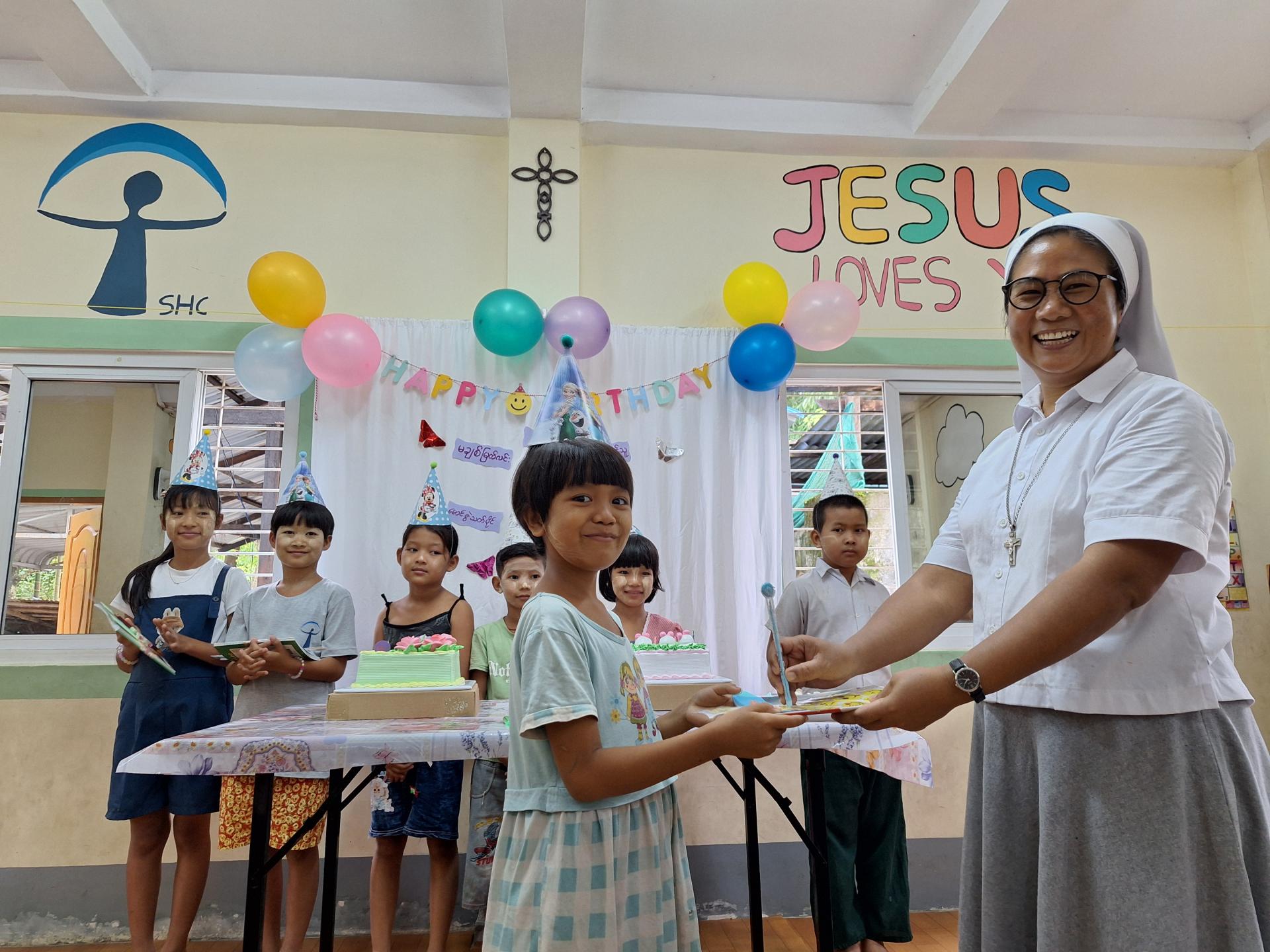 오후에는 기다리던 생일 파티가 시작되었습니다. 마리아 수녀님께서 파티를 인도해 주시고, 마가렛 수녀님은 학생들을 위해 기도해 주셨습니다. 안나 수녀님은 생일을 맞은 학생들에게 정성스럽게 준비한 선물을 전달했고, 1학년 학생들이 준비한 축하 노래가 분위기를 더욱 따뜻하게 만들었습니다. 매달 한 학년씩 돌아가며 축하 노래를 준비하고 있습니다.