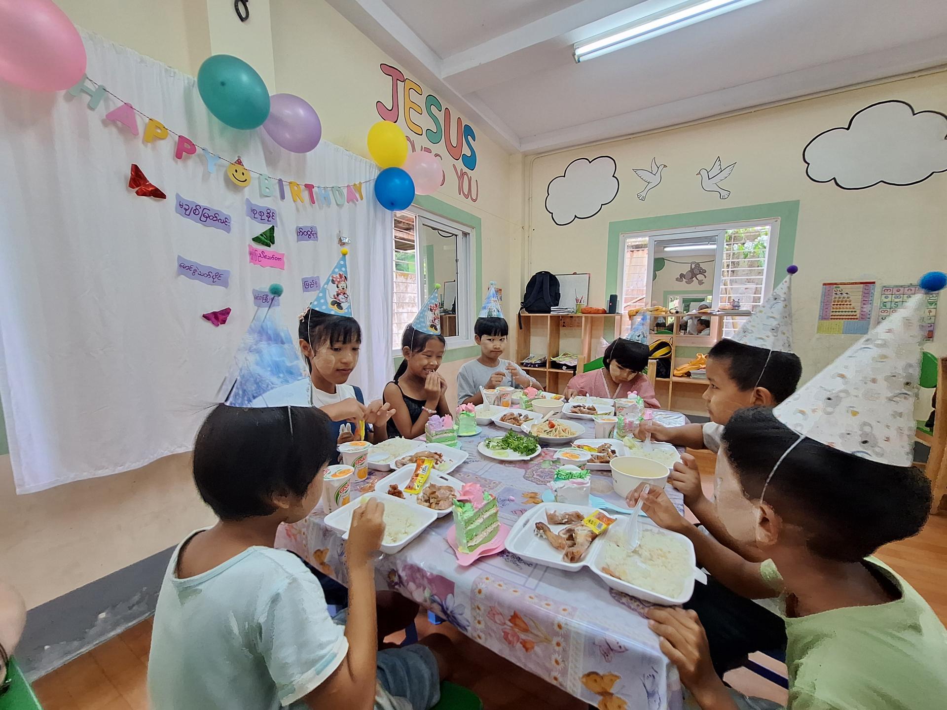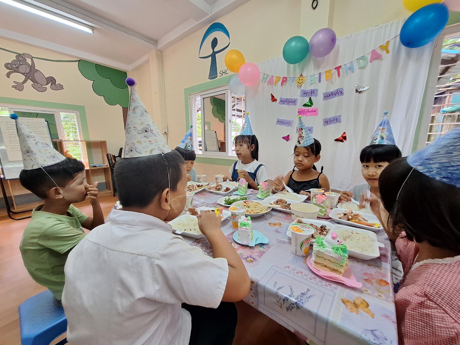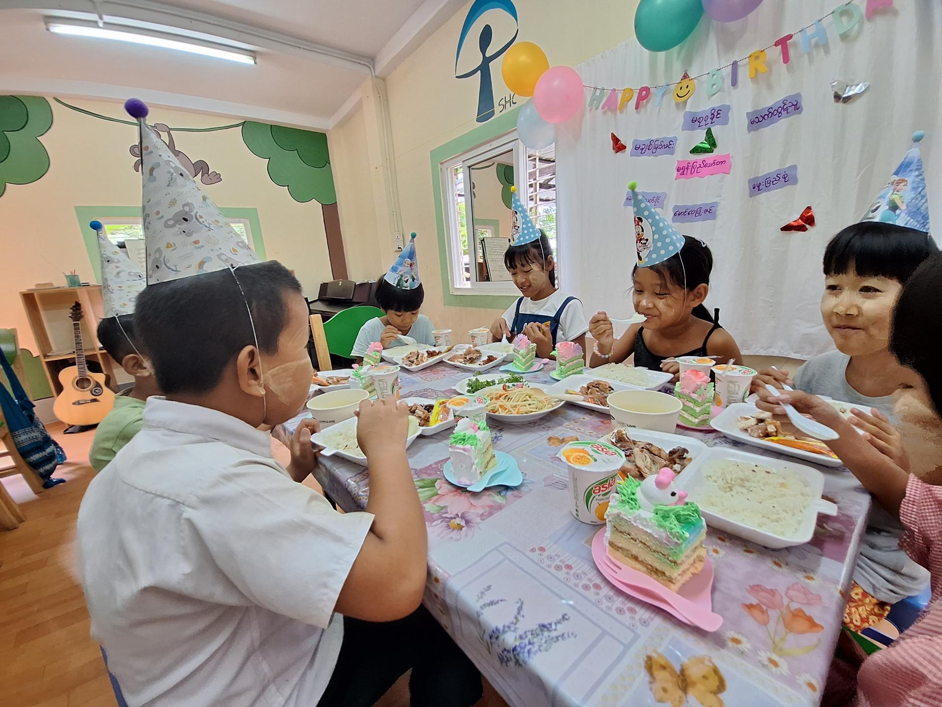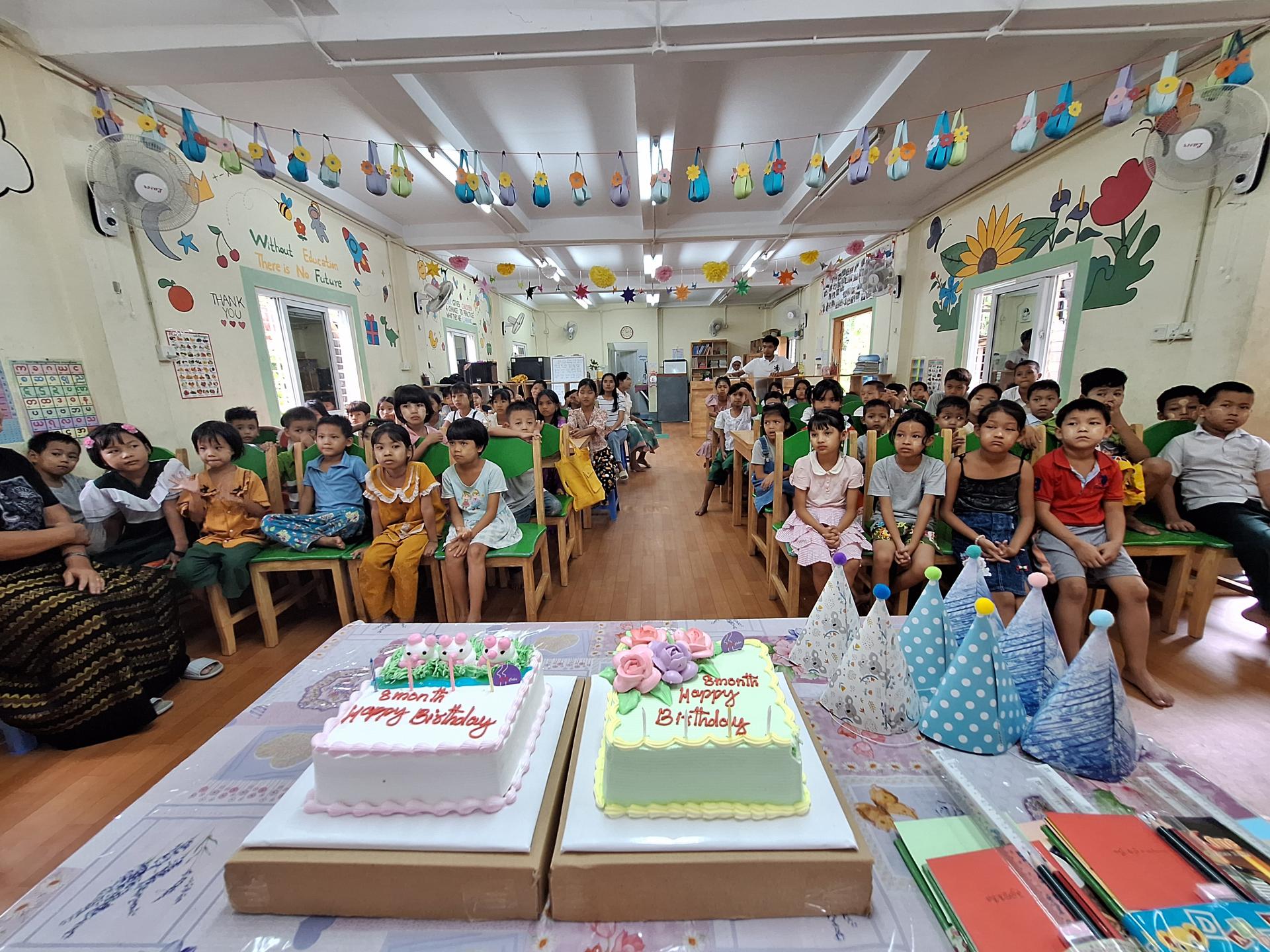 오늘은 8월에 생일을 맞이한 아이들을 위한 즐거운 생일 파티가 열렸습니다. 이번 달 주인공은 칫먓린, 수수카인, 때툰뚜, 와인표진, 줴때빠이, 푸삐에송, 슌삐에떠따 학생입니다.