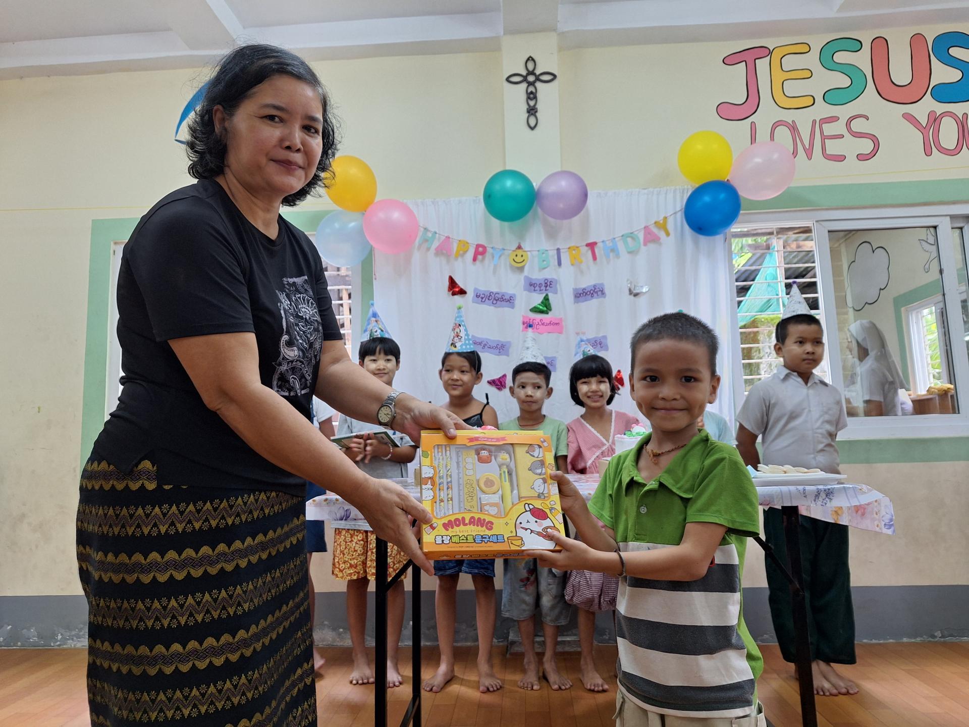 이어 촛불을 켠 케이크를 함께 나누고, 선물과 특별상 시상이 있었습니다. 이번 달 특별상은 4학년 째진아웅 학생이 받았습니다. 그는 예전에는 반에서 꼴찌였지만 성실한 노력 끝에 성적이 무려 10등이나 오르며 놀라운 성장을 보여주었습니다. 또한 공부방 생활에도 모범을 보이며 숙제를 충실히 하고 친구들과도 잘 지내고 있어 큰 격려와 축복을 받았습니다.